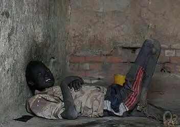 SPLA-IO spokesperson Col. Lam Paul Gabriel has shared a photo of an emaciated man chained to the ground, claiming it is the victim’s. While multiple sources confirm that the officer had indeed died, the photo is an old one.